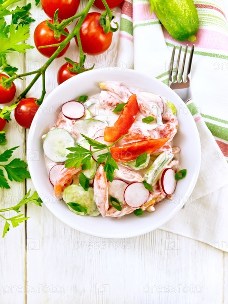 Салат из свежих овощей в тарелке на светлой доске сверху