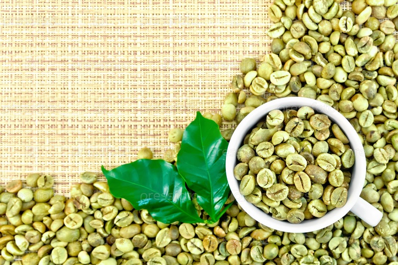 Кофе зеленый зерна с чашкой на желтой плетеной ткани