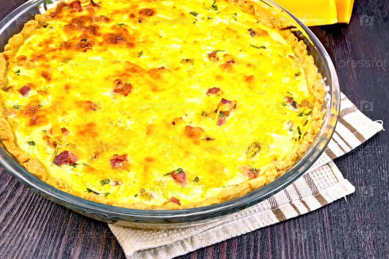 Киш с тыквой и беконом в сковороде на доске