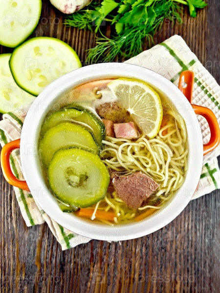 Суп с кабачками и лапшой в красной чаше на доске