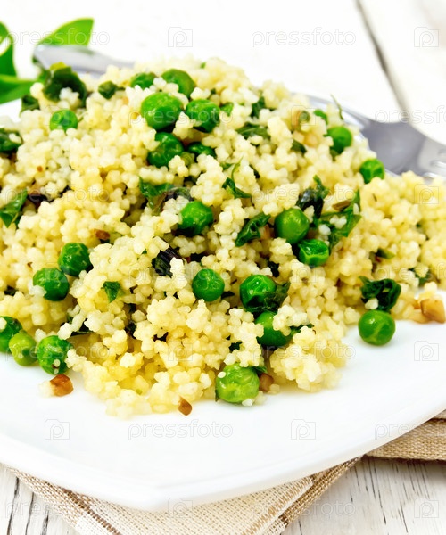 Кускус со шпинатом и зеленым горошком в чаше на деревянной доске