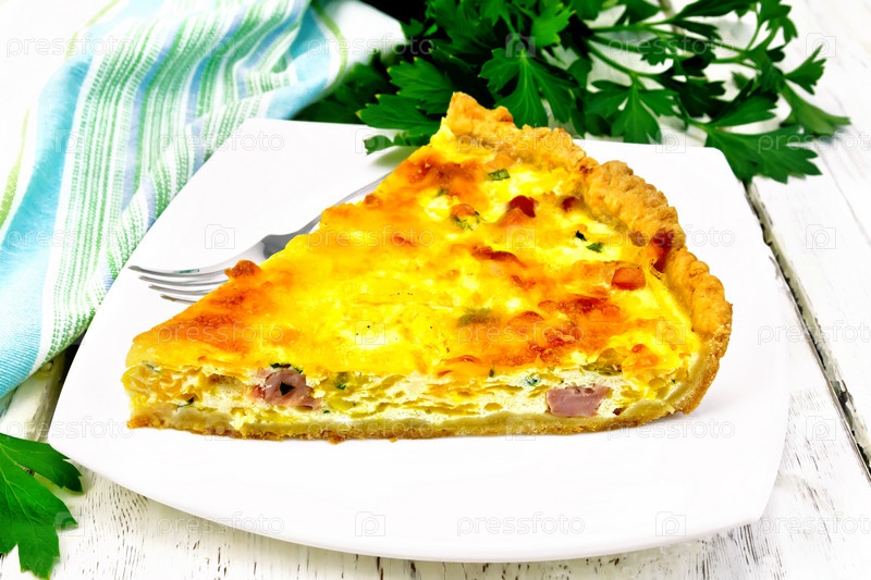Киш с тыквой и беконом в белой тарелке на светлой доске