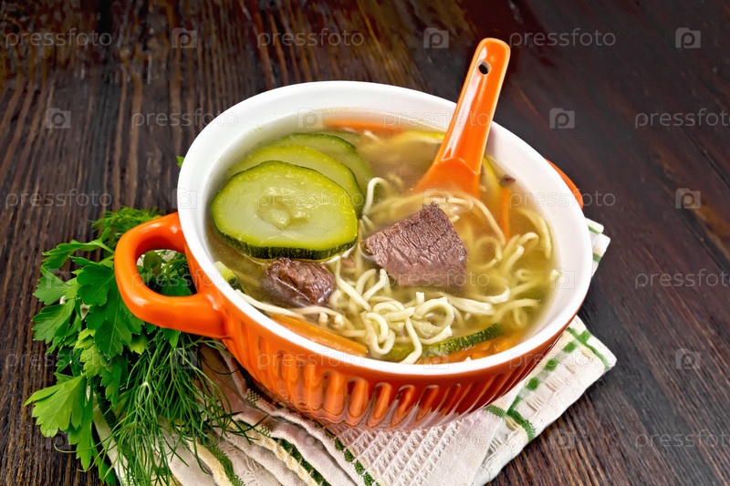 Суп с кабачками и лапшой в красной чаше на салфетке