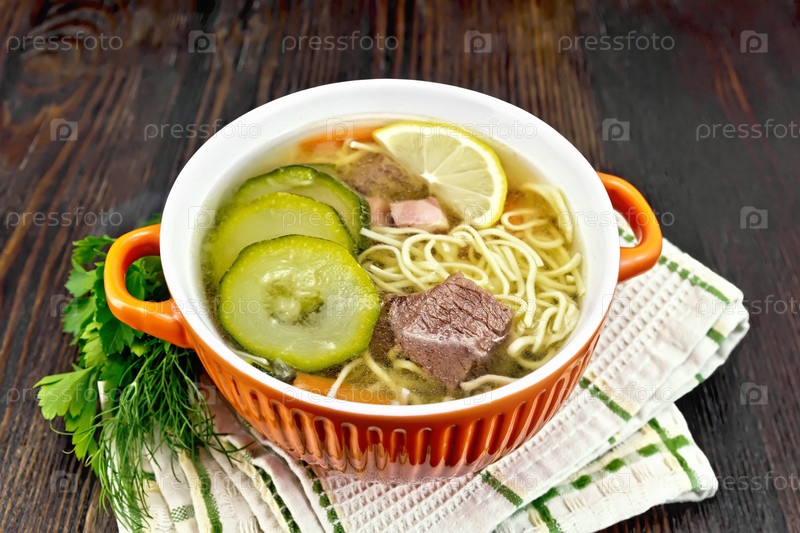 Суп с кабачками и лапшой в красной чаше на деревянной доске