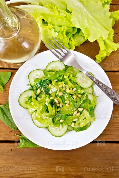 Салат из шпината и огурцов с салфеткой на доске сверху