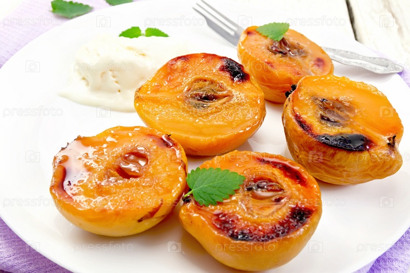Айва печеная с мороженым в тарелке на сиреневой салфетке