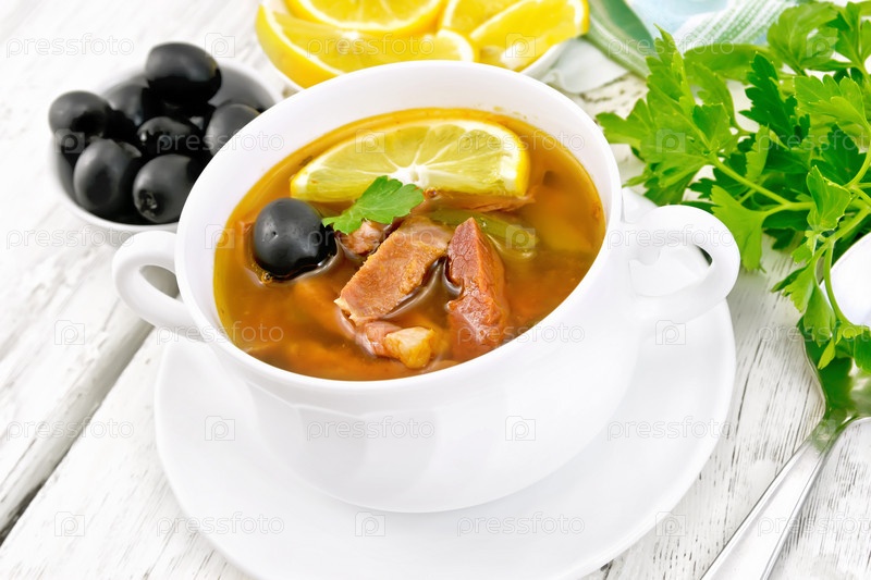 Солянка в белой чаше на доске