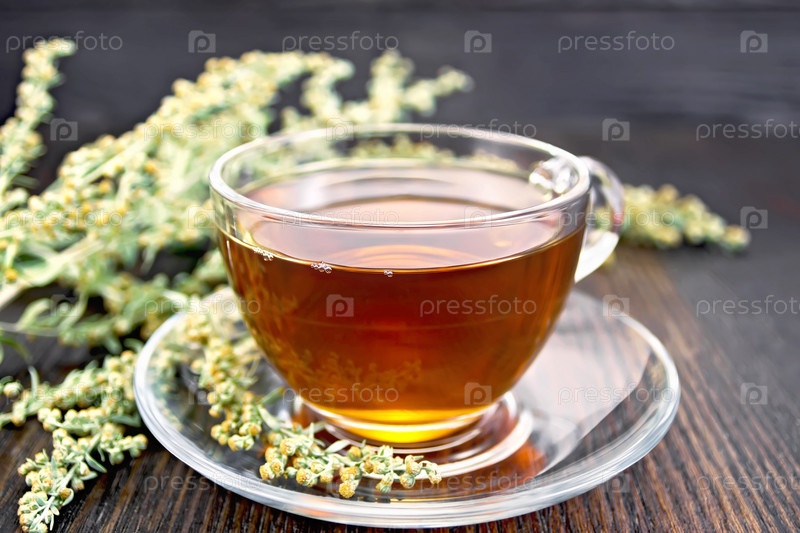 Чай с полынью в стеклянной чашке на столе
