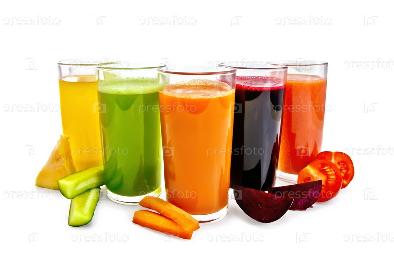 Сок овощной в пяти высоких стаканах с овощами