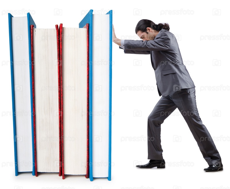 Предприниматель с книгами на белом фоне