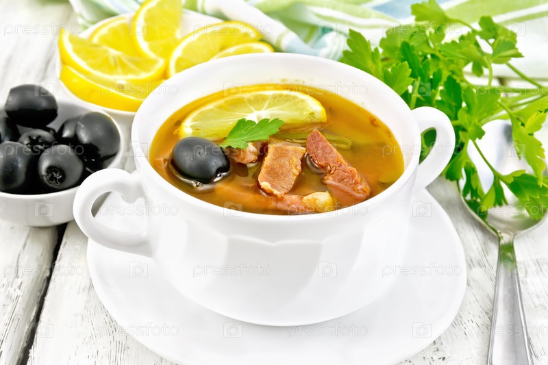 Солянка в белой чаше на светлой доске
