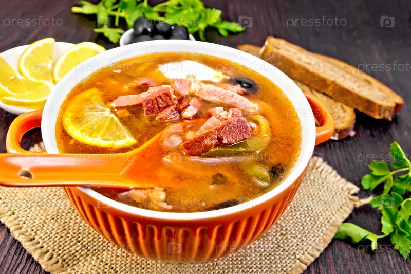 Солянка в чаше на темной доске