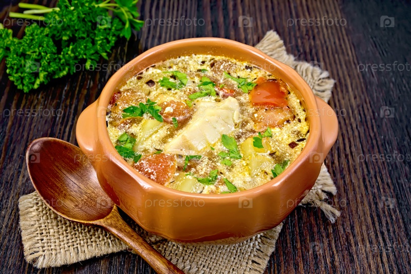 Суп рыбный с овощами и зеленью на доске