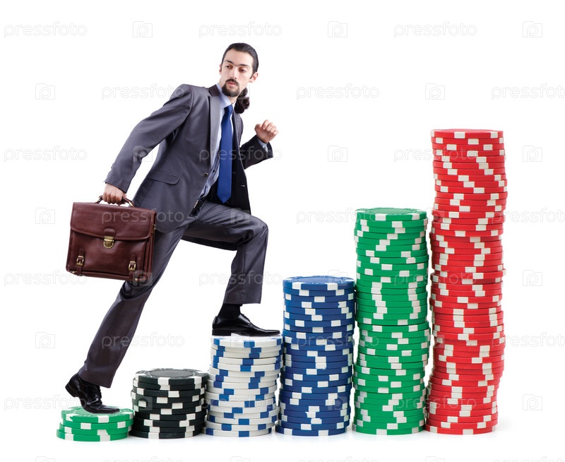 Бизнесмен карабкается по стопкам фишек, на белом фоне