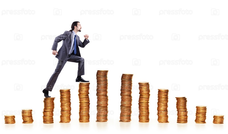 Бизнесмен и стопки золотых монет