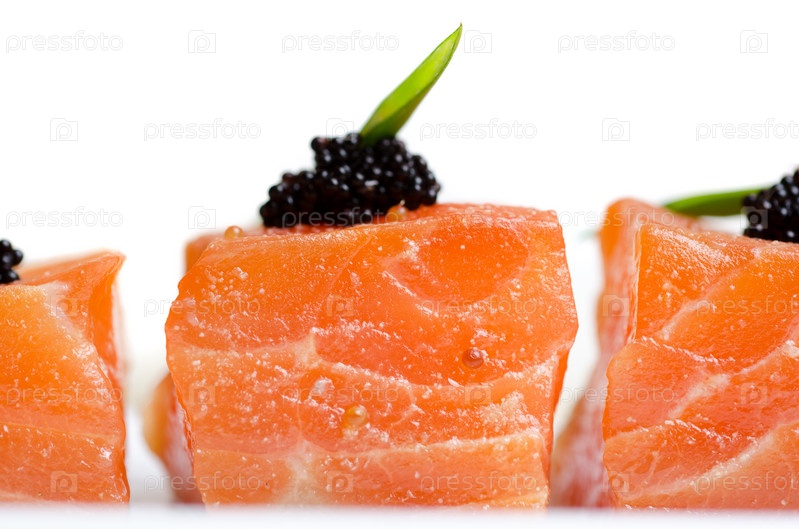 Кусочки лосося с зеленью и черной икрой тобико