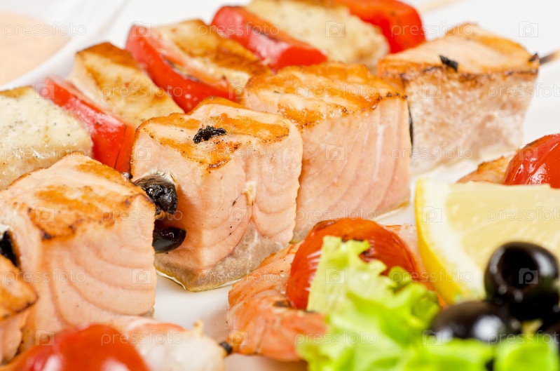 Лосось и креветки с помидорами и перцем