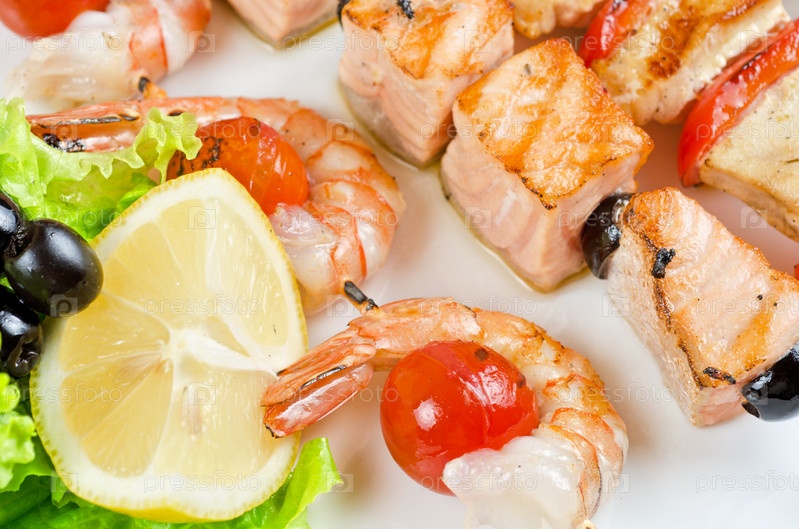 Лосось и креветки с лимоном и оливками