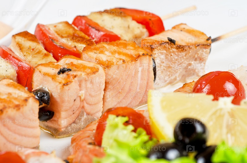 Лосось гриль и креветки с помидорами и перцем на бамбуковых шпажках