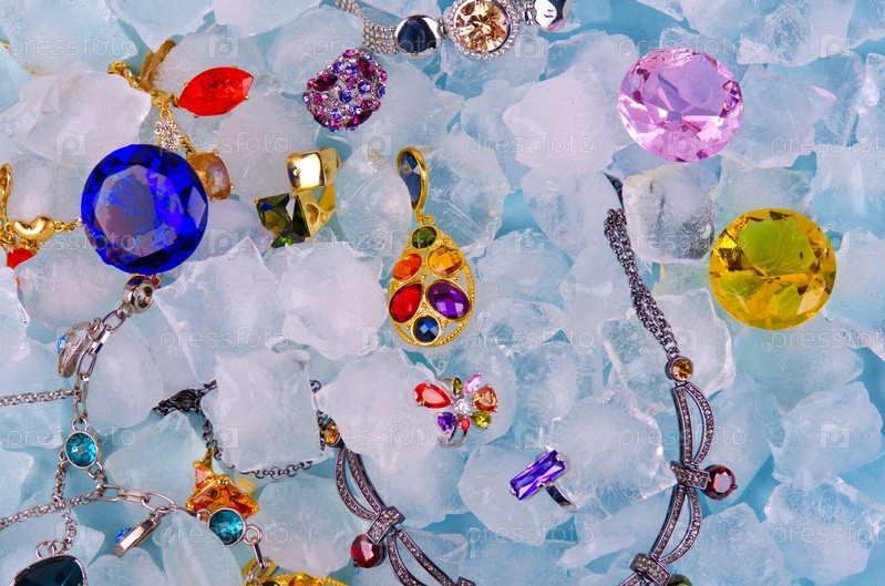 Драгоценности на голубых кубиках льда