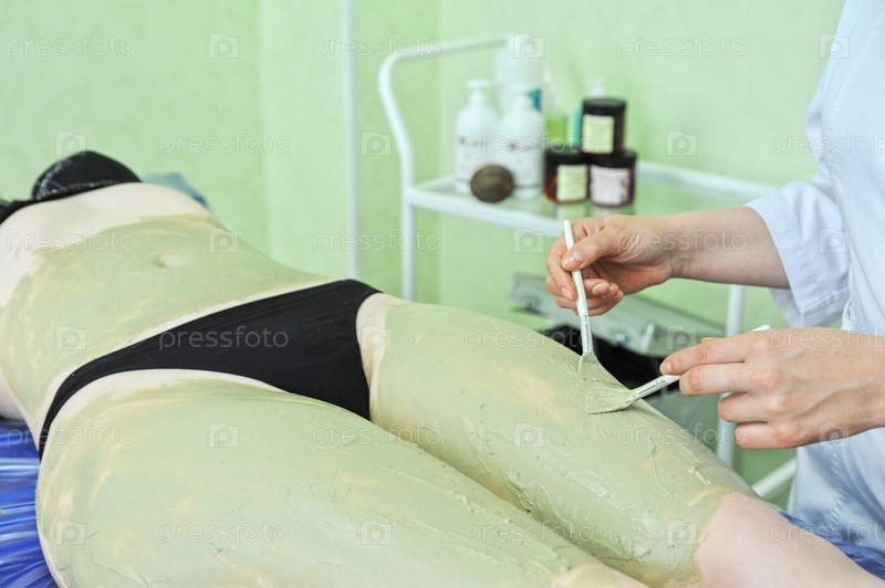 Женщине делают глиняную маску на тело в косметическом кабинете