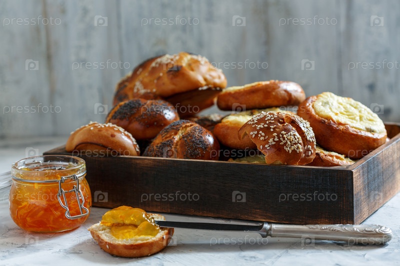 Деревянный поднос с булочками и банка апельсинового джема