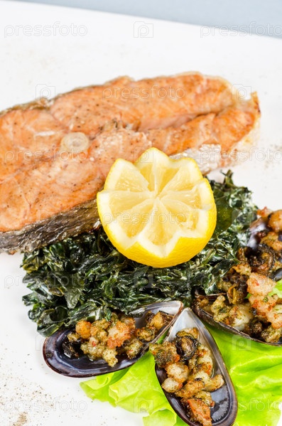 Стейк из лосося с водорослями, мидиями и лимоном