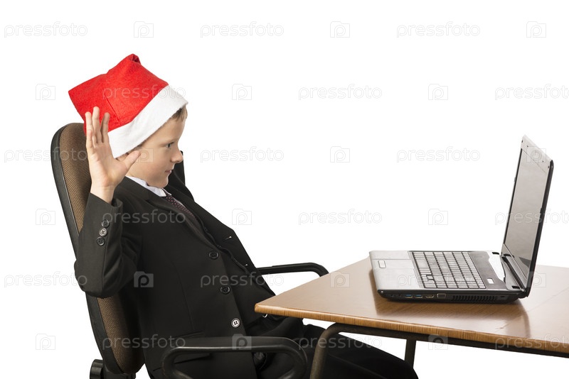 Мальчик в шляпе Санта-Клауса за компьютером