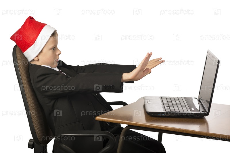 Мальчик в шляпе Санта-Клауса за компьютером