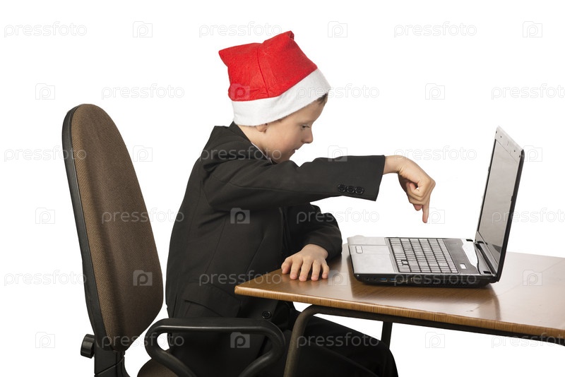 Мальчик в шляпе Санта-Клауса за компьютером