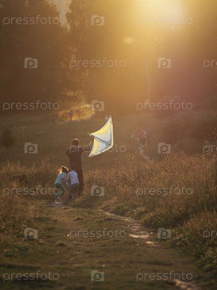 Семья запускает воздушного змея в парке на закате
