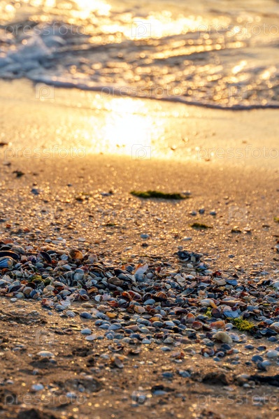 Цветные раковины в прибое с водорослями и песком на закате