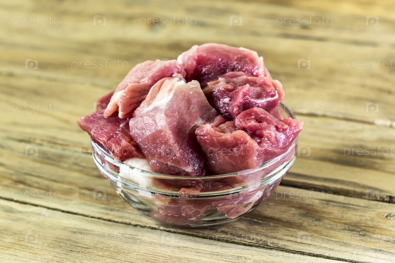 Свежее мясо, нарезанный на куски в стеклянной вазе