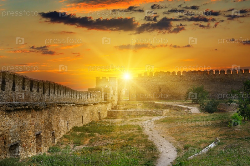 Восход солнца над крепостной стеной средневековой крепости. Аккерман, Украина