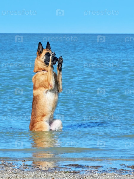 Малинуа Бельгийский сидит в море
