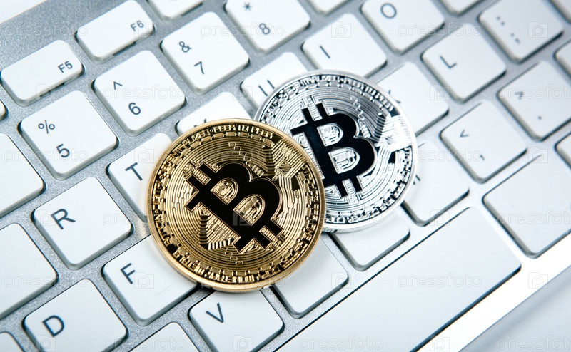 Монеты биткоины на клавиатуре ноутбука