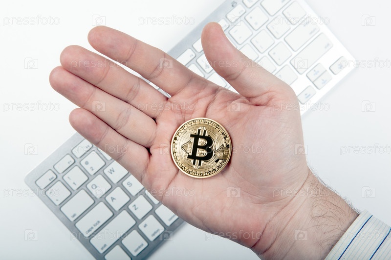 Золотая монета биткоин в руке человека