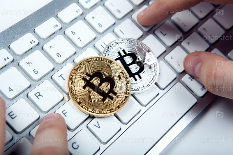 Монеты биткоины на клавиатуре ноутбука