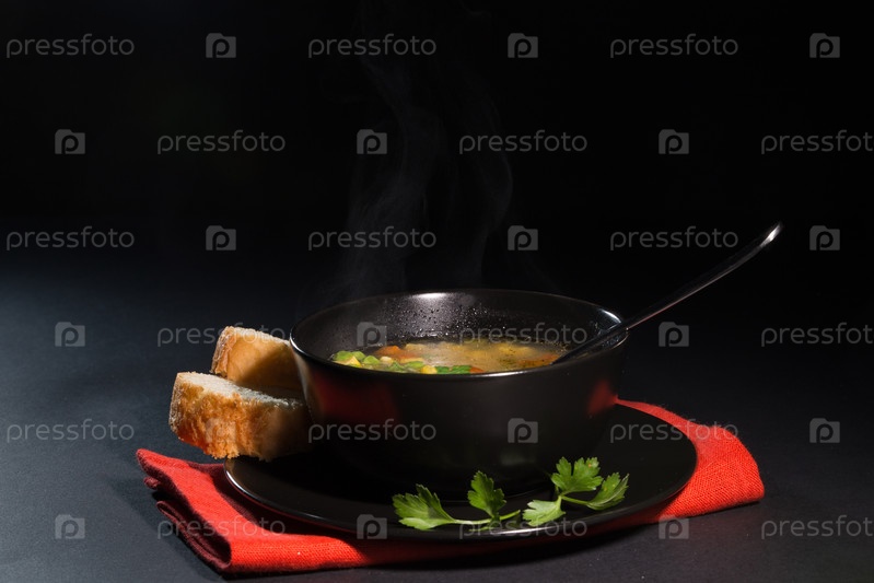 Овощной суп в черной тарелке