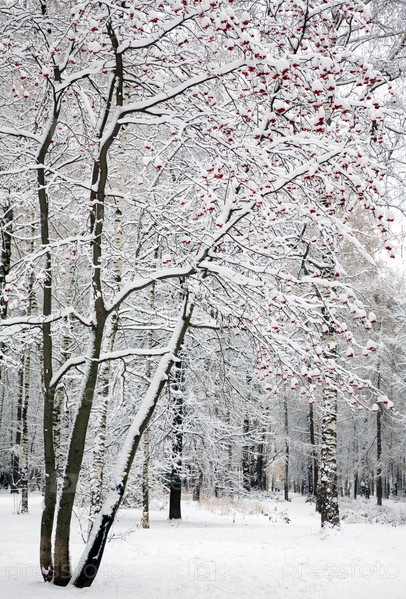 Рябина с красными ягодами в снегу