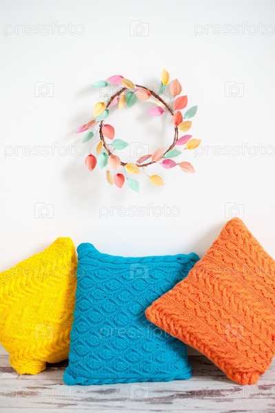 Разноцветные подушки в интерьере и яркий венок