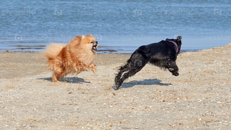 Померанский шпиц играет с цвергшнауцером