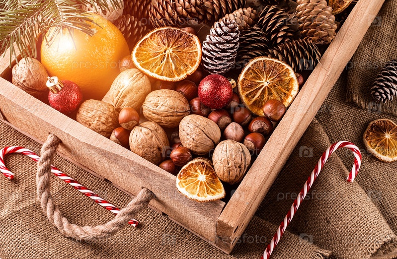 Ящик с рождественскими украшениями, орехами, шишками и украшением