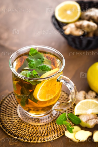 Горячий травяной чай со свежим лимоном, имбирем и листьями мяты