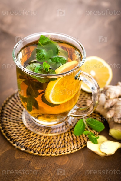 Горячий травяной чай со свежим лимоном, имбирем и листьями мяты