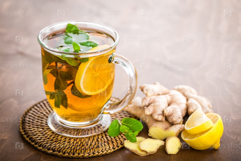 Горячий травяной чай со свежим лимоном, имбирем и листьями мяты