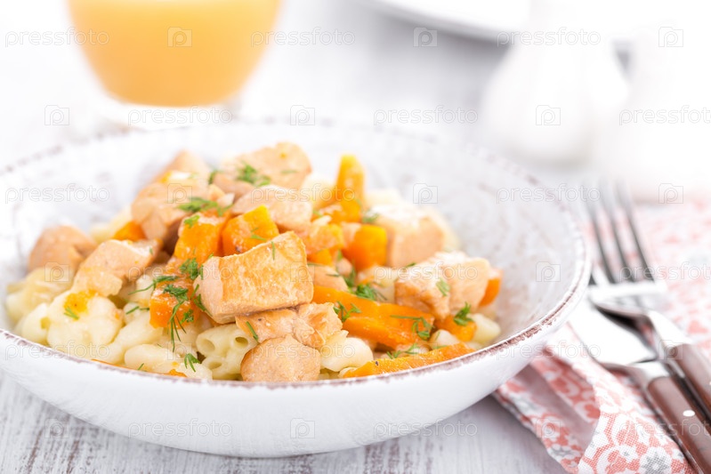 Тушеное куриное мясо с морковью в соусе с макаронами