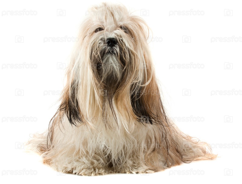Симпатичная годовалая собака породы лхаса апсо сидит на белом фоне