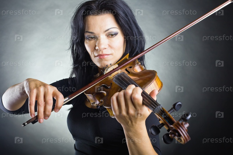 Красивая брюнетка играет на скрипке на темном фоне