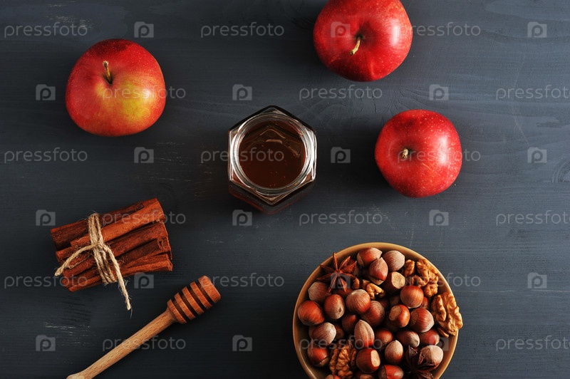 Яблоки, мед, орехи, корица